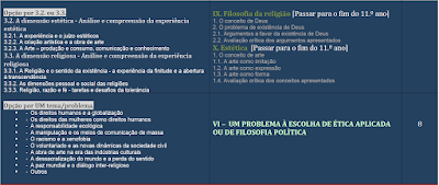 Como se pode ver aqui, deixa de haver filosofia da religião e estética no 10.º ano. Qualquer professor sabe que o tempo disponível não é suficiente para lecionar todos os conteúdos previstos para o 10.º, que tem muito mais conteúdos do que o do 11.º ano. Os conteúdos anteriores são mais do que suficientes para nos ocupar o ano inteiro.